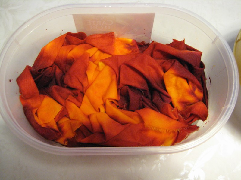 I also did some icecream tub dyeing with EMO Tuotanto's fibre reactive dye later. I'm trying to explore this product, since it's a Finnish brand, and a lot easier to get hold of for me than Procion MX dyes. I hope to discover ways of using the EMO dyes in the same ways that I've used Procion MX dyes. That would make me a very happy puppy.