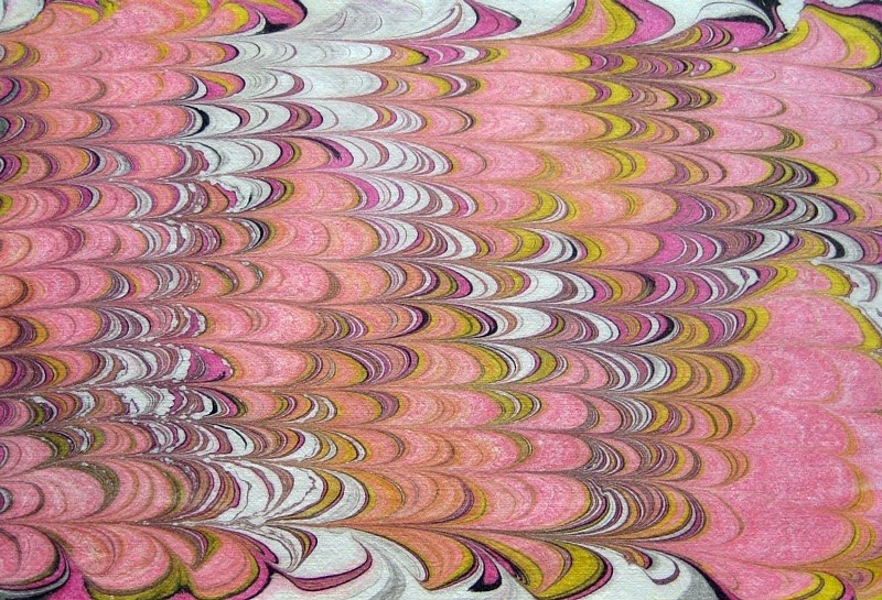 here, when I first tried marbling with wallpaper paste as the base, or size as it's called. The results were quite pleasing, but not what I had expected, as the paints didn't behave the way I wanted them to. In traditional marbling, the paints float out on the surface of the size and you can build patterns with circles within circles. Not so with the wallpaper paste.